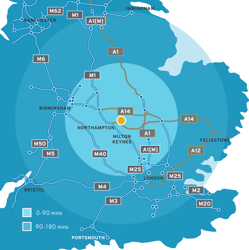 Kettering is situated within the UK’s ‘Golden Triangle’, considered the premier distribution location in the UK, due to its accessibility to the national road and motorway network with approximately 90% of the population being accessible within a four-hour drive time. As a result of its excellent connectivity, the ‘Golden Triangle’ has become the key strategic location for the UK’s supply chain, with a high concentration of retailers, distribution, and 3PL Operators occupying hubs within the region.